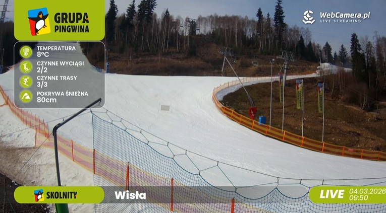 Na stoku Skolnity Wisła utrzymują się wiosenne warunki do jazdy. W środę, 4 marca 2026 roku, przed południem temperatura wynosi około 8 stopni Celsjusza, a pokrywa śnieżna sięga około 80 centymetrów. Mimo dodatnich temperatur trasy w Skolnity Ski & Bike Park pozostają przygotowane i przejezdne.