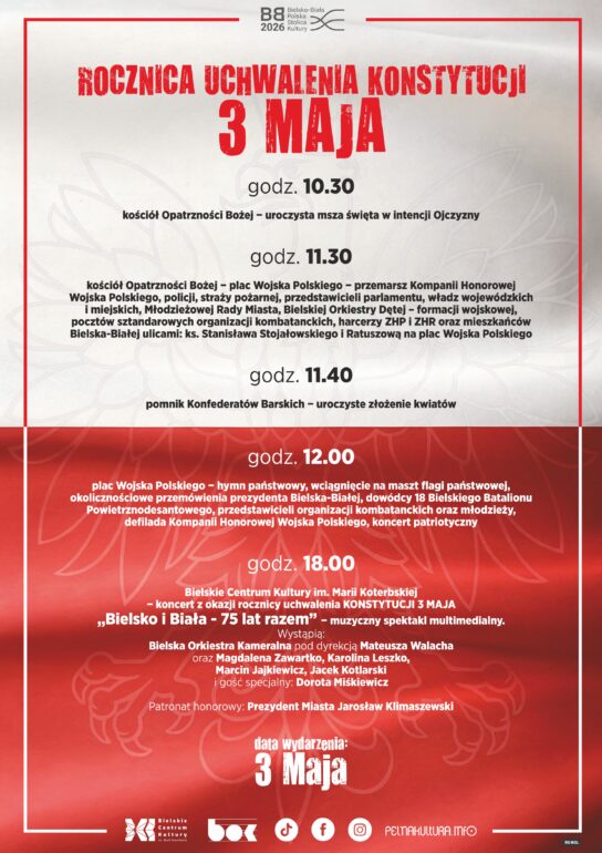 W programie obchodów 235. rocznicy uchwalenia Konstytucji 3 maja, zaplanowano przemówienia, defiladę,  koncert patriotyczny oraz widowisko  pt. „Bielsko i Biała – 75 lat razem”!