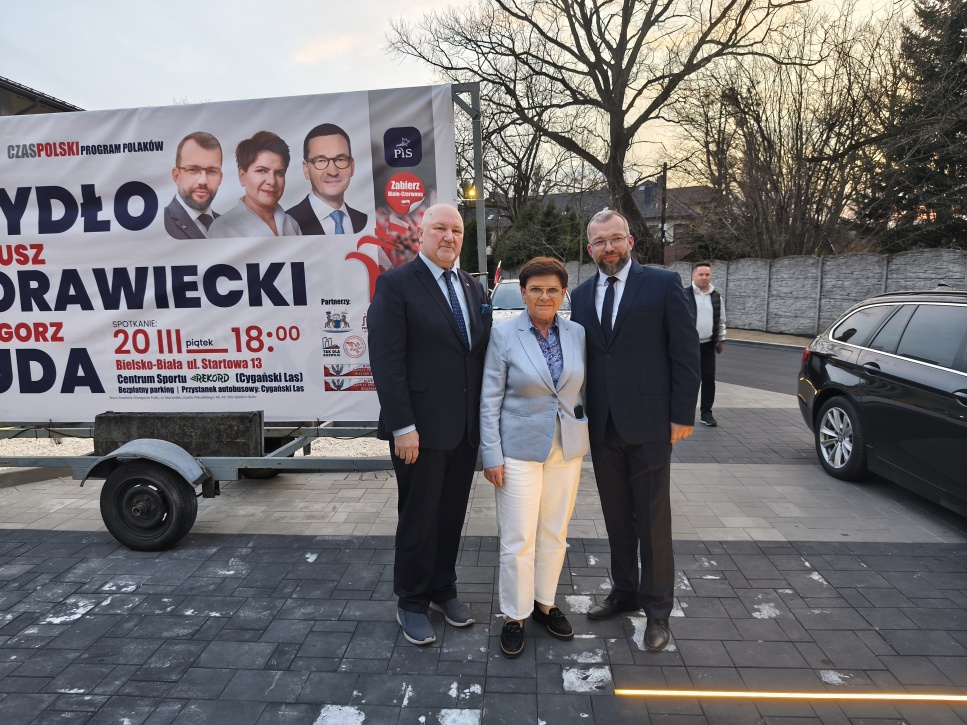 W piątek 20 marca w nowej hali Rekordu w Cygańskim Lesie w Bielsku-Białej odbyło się spotkanie polityczne z udziałem byłych premierów Beaty Szydło i Mateusza Morawieckiego oraz ministra Grzegorza Pudy. Wydarzenie zgromadziło kilkaset osób i trwało około dwóch godzin. Po wystąpieniach polityków uczestnicy mogli zadawać pytania.