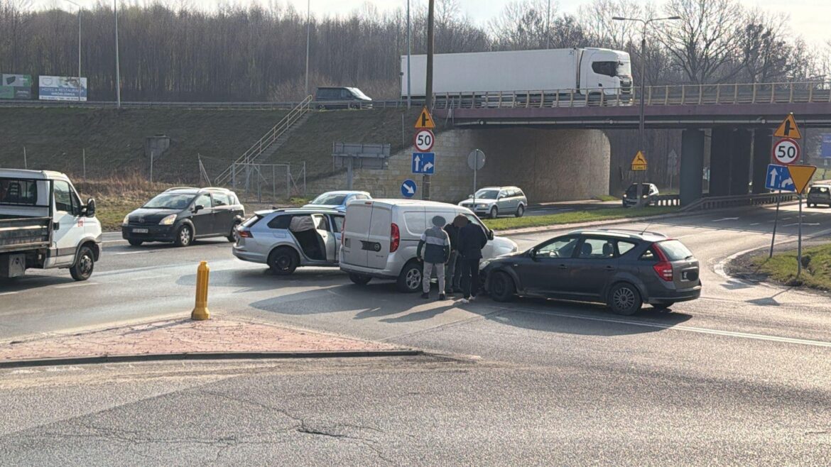 Poranna kraksa na trzy samochody na wysokości zjazdu z trasy S52 na alei Andersa w Bielsku-Białej. Uczestniczyły w niej volkswagen, fiat i kia.