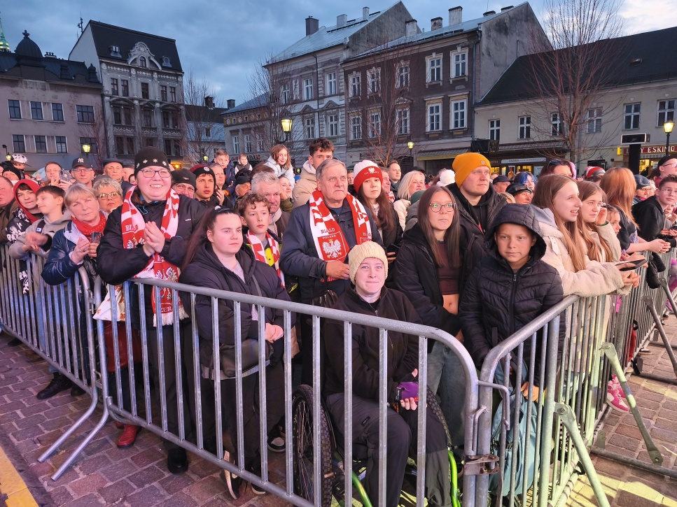 Na placu Wojska Polskiego w Bielsku-Białej zebrały się w niedzielę tłumy mieszkańców, aby powitać trzykrotnego medalistę olimpijskiego, Kacpra Tomasiaka. Skoczek narciarski specjalnie przełożył wylot na mistrzostwa świata juniorów w Norwegii, by spotkać się z kibicami i odebrać gratulacje od władz miasta oraz lokalnej społeczności. Na scenie towarzyszyli mu rodzice, a także prezydent miasta.