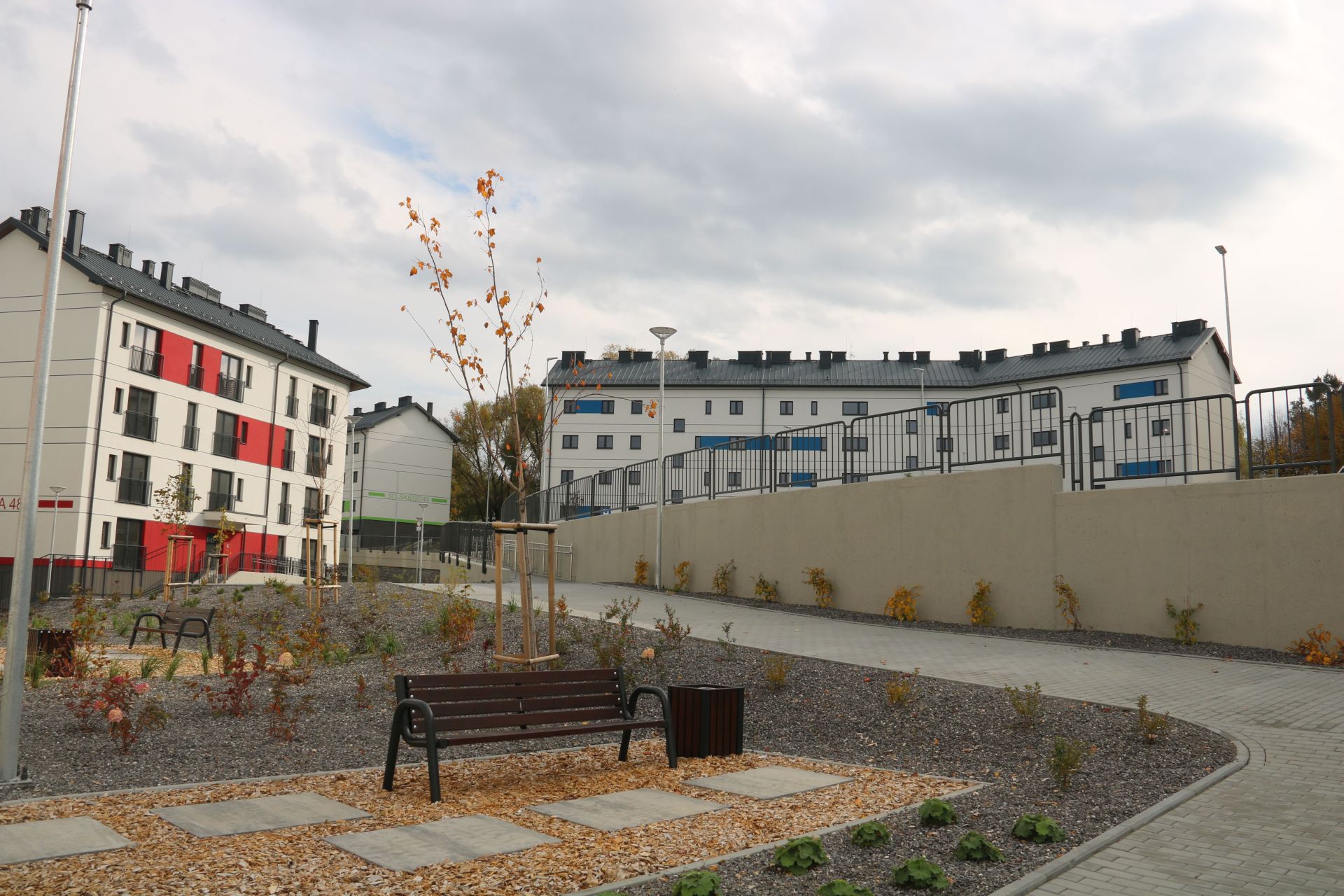 Teren pomiędzy blokami zagospodarowano i obsadzono drzewami (168 sztuk) oraz ustawiono na nim ławki.