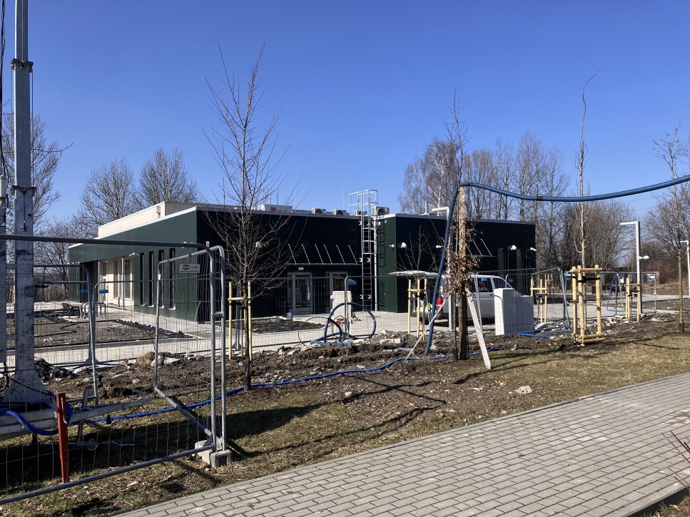 Obecnie trwają prace wykończeniowe wewnątrz budynku oraz zagospodarowanie terenu wokół obiektu.