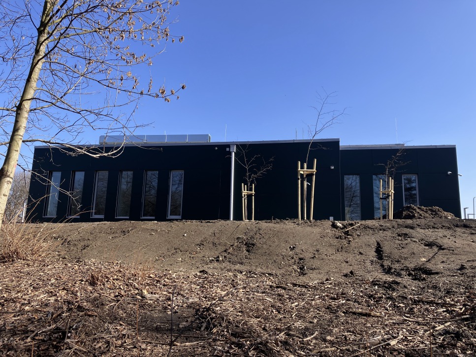 Obecnie trwają prace wykończeniowe wewnątrz budynku oraz zagospodarowanie terenu wokół obiektu.