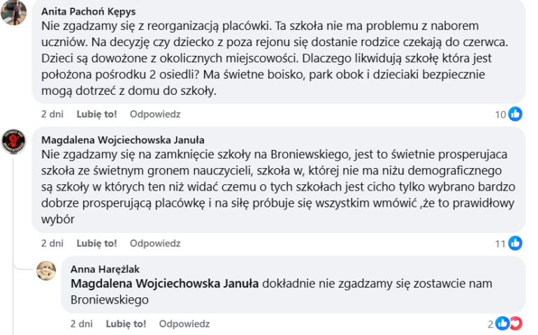 Wielu rodziców podkreślało, że decyzje administracyjne ignorują realne potrzeby dzieci i sytuację lokalną. „Szkoła przy ul. Broniewskiego 23 jest przepełniona i zawsze będzie miała nabór. Kadra nauczycielska jest cudowna! Proszę nie robić reorganizacji tam, gdzie nie trzeba” – wskazywała inna z komentujących. Podkreślano również występujący zdaniem rodziców chaos informacyjny. Przede wszystkim, rodzice nie wiedzą, czy deklarować pozostawienie dziecka w obecnej placówce, czy też szukać alternatywy.