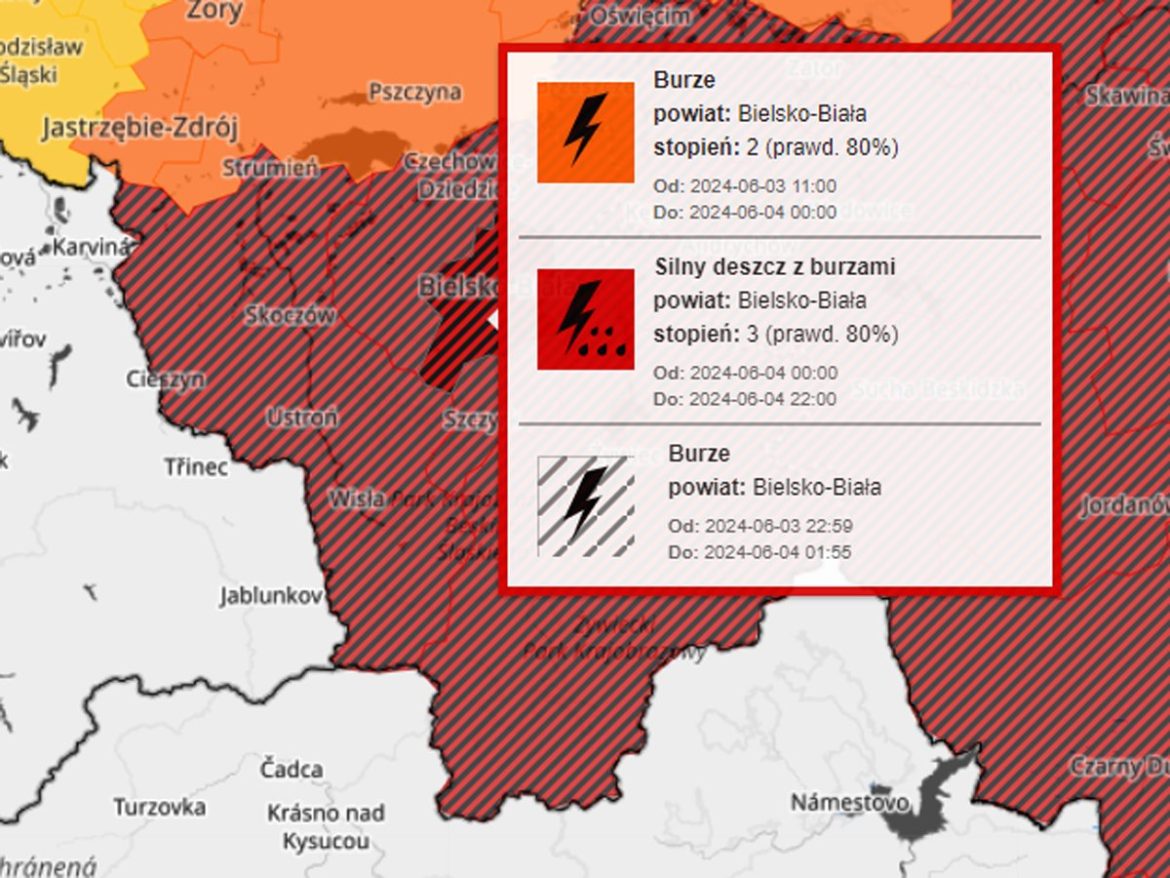 Najwyższy, 3. stopień zagrożenia przed silnym deszczem z burzami dla kilkunastu powiatów w województwach śląskim i małopolskim wydał Instytut Meteorologii i Gospodarki Wodnej.