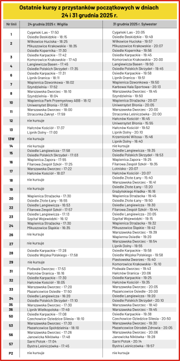 Po zakończeniu kursowania linii dziennych uruchomione zostaną dodatkowe kursy linii nocnych N1 i N2 z przystanku „Zajezdnia MZK” o godzinach 18:40, 20:10 i 21:40 oraz z przystanków „Wapienica Centrum” i „Hałcnów Kościół” o godzinach 19:25, 20:55 i 22:25.