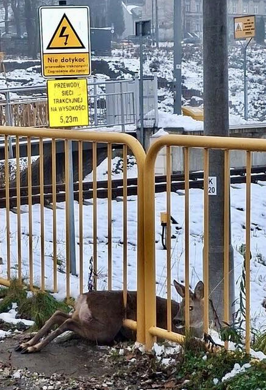 Sarna zaklinowała się w barierkach obok przejazdu kolejowego na ul. Brodzińskiego w Cieszynie. Zwierzę nie było w stanie się wydostać.