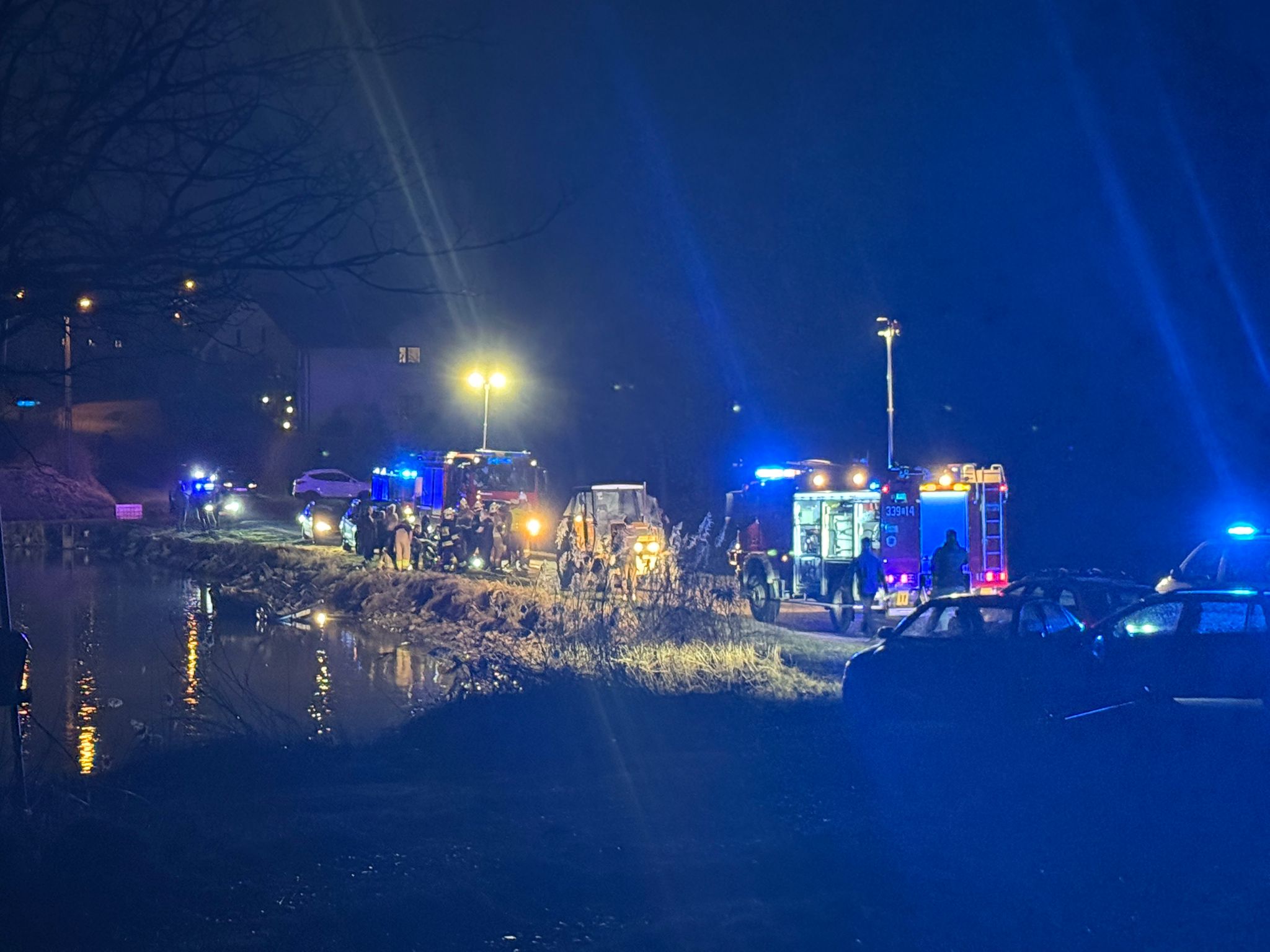 Na miejscu działają już strażacy, którzy wyciągają samochód z wody.