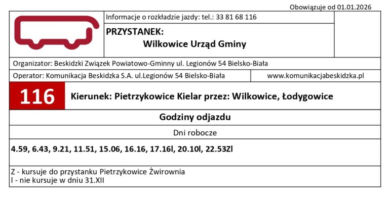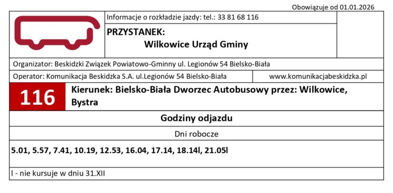 – Z przyjemnością informuję, że od 1 stycznia autobus Komunikacji Beskidzkiej linii 116 znów kursuje trasą przebiegającą obok Urzędu Gminy w Wilkowicach i ośrodka zdrowia – mówi Maciej Mrówka.
