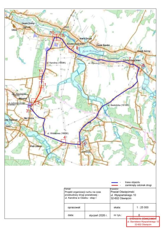 Ruch samochodowy zostanie skierowany na drogi powiatowe w sąsiednich miejscowościach. Objazd poprowadzi przez ul. Widokową w Witkowicach, ul. Beskidzką w Witkowicach i Osieku oraz ul. Główną w Osieku.