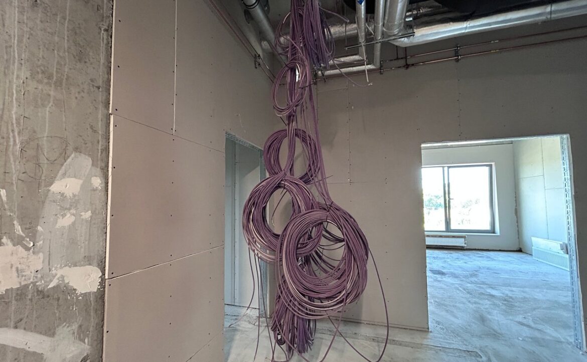 Dzisiaj pokazano jak wygląda postęp przy pierwszym etapie prac. Na 4 tysiącach metrów powstają ścianki działowe i podstawowe instalacje do wydzielonych przestrzeni i sal.