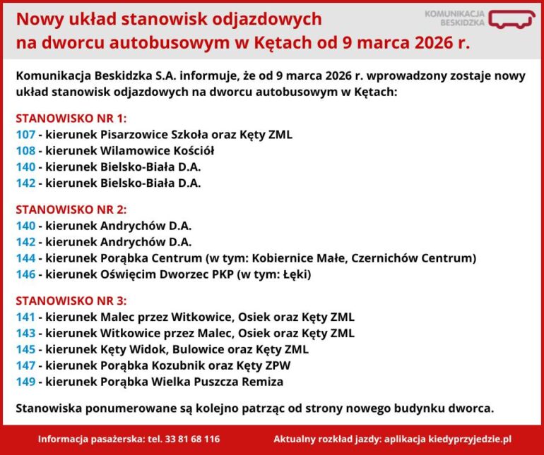 Komunikacja Beskidzka SA poinformowała, że od 9 marca obowiązuje nowy podział stanowisk odjazdów autobusów na dworcu w Kętach. Pasażerowie powinni sprawdzać oznaczenia przy stanowiskach, ponieważ w każdej gablocie znajduje się numer oraz rozkład jazdy.