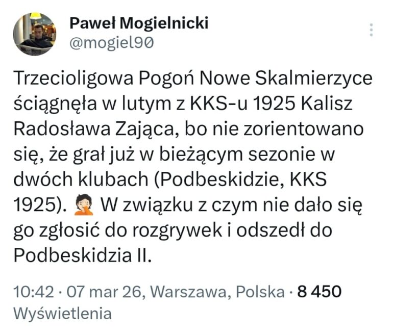 Historia, która doprowadziła do powrotu zawodnika do Podbeskidzia, jest mocno niecodzienna. Jak wyjaśnił na platformie X Paweł Mogielnicki, wszystko rozbiło się o kwestie formalne i możliwości zgłoszenia zawodnika do rozgrywek.