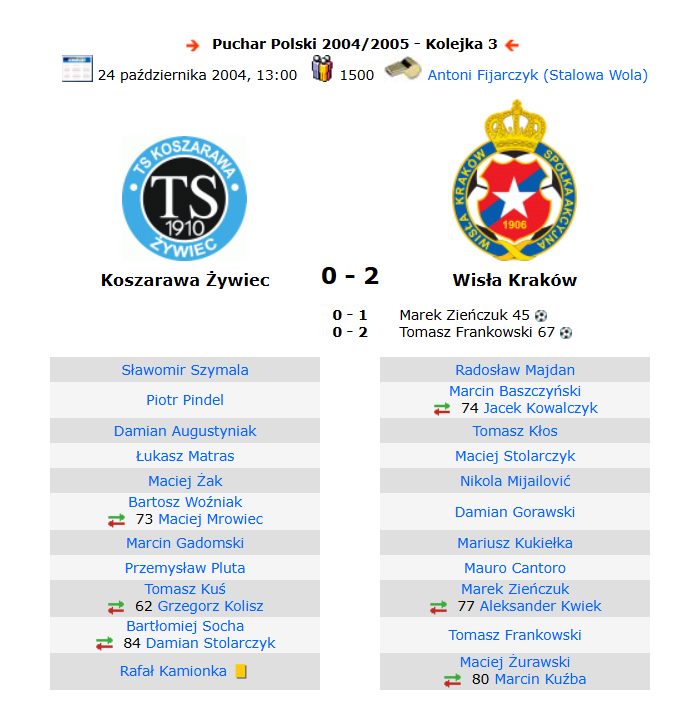 W sezonie 2004/05 występująca wówczas w IV lidze Koszarawa Żywiec miała okazję zmierzyć się z Wisłą Kraków. Los skojarzył oba zespoły w rozgrywkach Pucharu Polski… Dzięki temu, 24 października 2004 roku murawę stadionu przy alei Wolności wybiegła drużyna mistrza kraju. To był zespół naszpikowany gwiazdami z Tomaszem Frankowskim, Maciejem Żurawskim, czy Radosławem Majdanem… Z byłym golkiperem reprezentacji Polski udało nam się porozmawiać przy okazji niedawnej konferencji zapowiadającej Galacticos Show – więcej na temat tego wydarzenia przeczytacie TUTAJ.