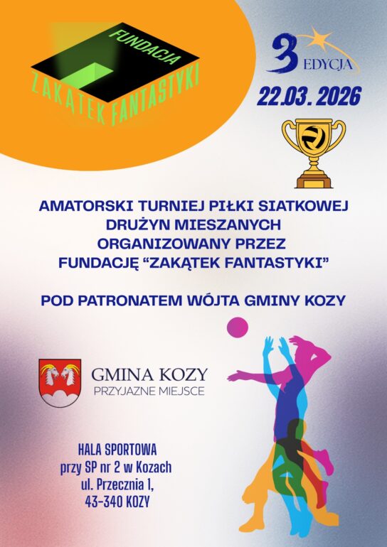 Już 22 marca 2026 roku w hali sportowej przy Szkole Podstawowej nr. 2 w Kozach odbędzie się trzecia edycja amatorskiego turnieju siatkarskiego drużyn mieszanych, organizowanego przez Fundację Zakątek Fantastyki. Wydarzenie cieszy się coraz większym zainteresowaniem zarówno uczestników, jak i kibiców…